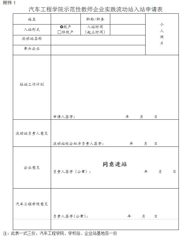 教師填寫(xiě)《汽車(chē)工程學(xué)院示范性教師企業(yè)實(shí)踐流動(dòng)站進(jìn)站申請(qǐng)表》(附件1),流動(dòng)站負(fù)責(zé)人審核,并按照《專(zhuān)業(yè)教師赴企業(yè)實(shí)踐鍛煉管理辦法》辦理相關(guān)手續(xù),選擇企業(yè)導(dǎo)師,報(bào)人事處備案。